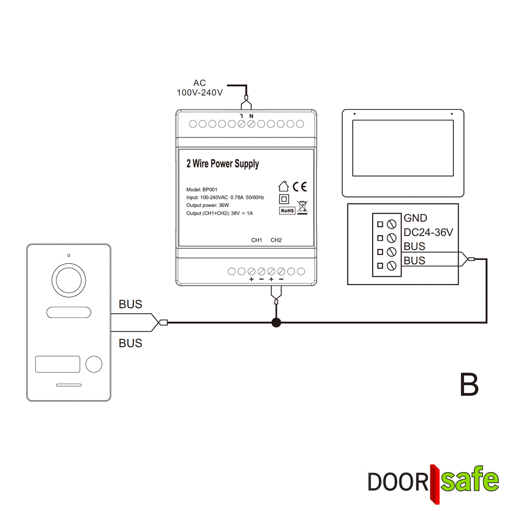 B. Kan worden toegevoegd aan de 2 draads BUS verbinding van buiten-unit naar het scherm.