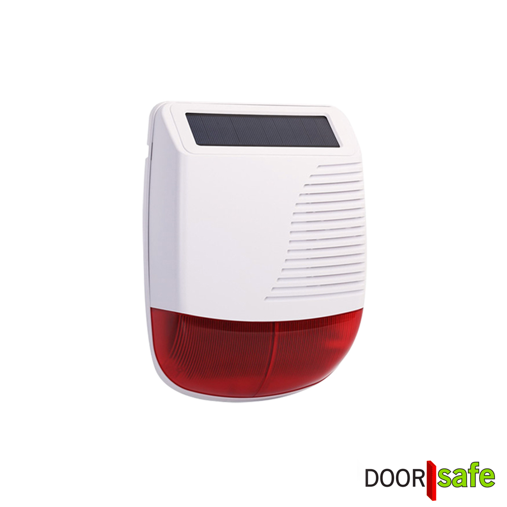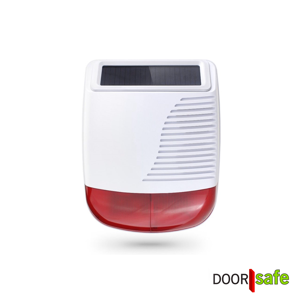 Deze draadloze buitensirene met zonnepaneel kan worden gekoppeld aan het alarmsysteem DS3300. Bij activering van het alarm klinkt een luide sirene en knippert een rood waarschuwingslicht.