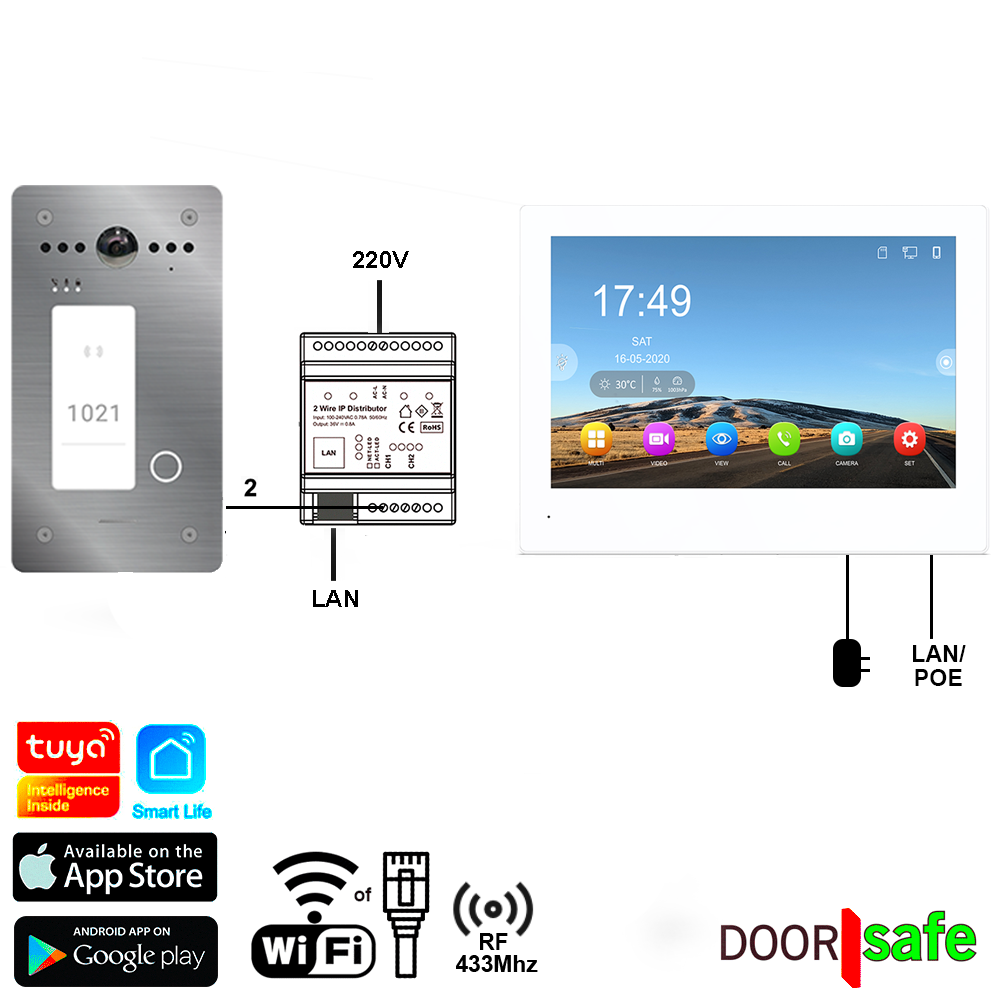 - Laat dit scherm via WiFi of een (POE) netwerkkabel met dezelfde internet router verbinden als de DS6702 internet module, en verbindt deze module met een 2 draadskabel met een van deze buiten-units: DS7785 / DS7775 / DS7885 / DS7886 / DS7887 / DS7888 / DS7889 (max. 4).